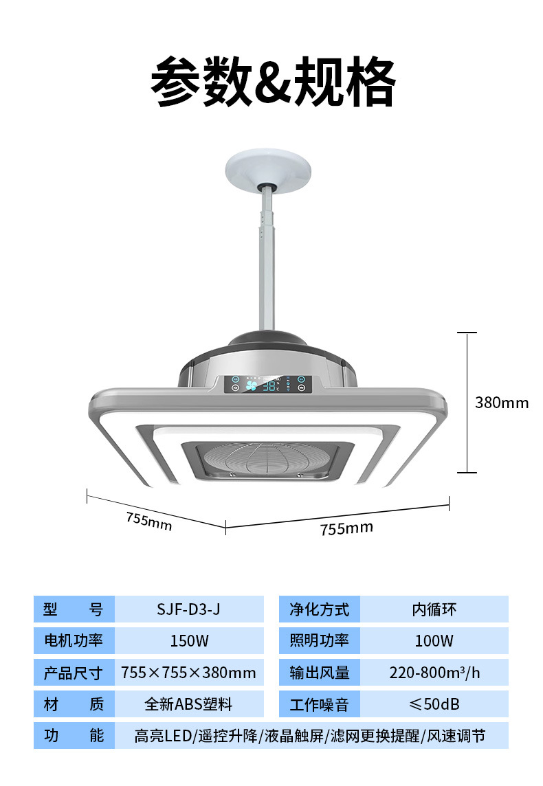 【功能】高亮LED/遙控升降/液晶觸屏/濾網(wǎng)更換提醒/風速調(diào)節(jié)