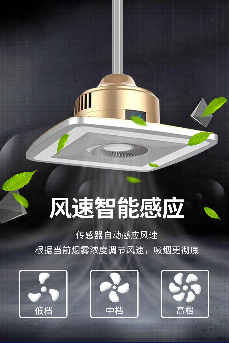傳感器自動感應(yīng)風(fēng)速,根據(jù)當(dāng)前煙霧濃度調(diào)節(jié)風(fēng)速,三擋調(diào)節(jié)。多重凈化技術(shù)。