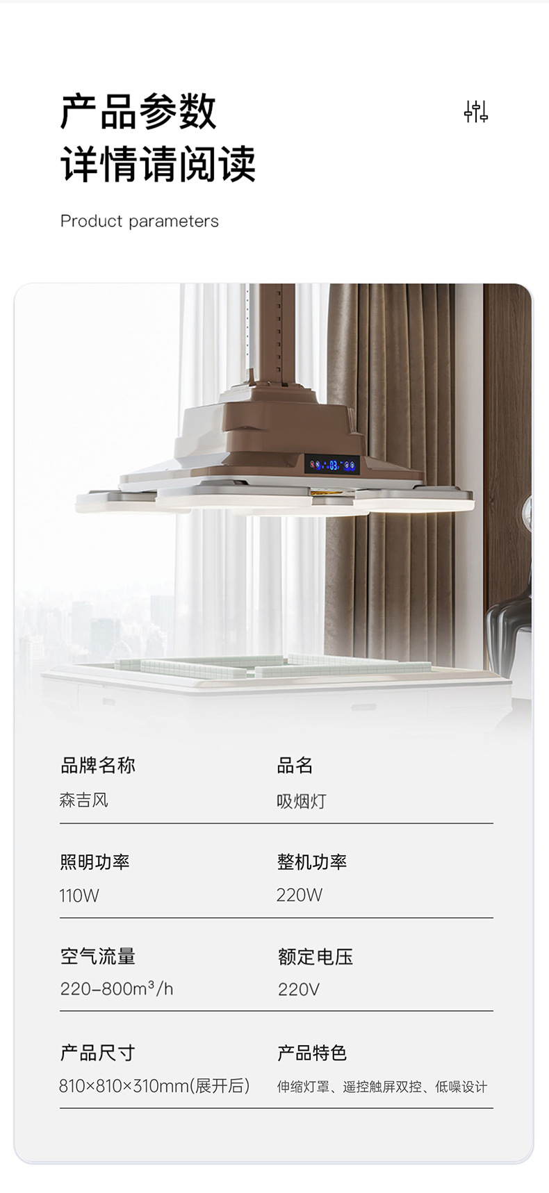 燈罩自動(dòng)伸展,光照覆蓋更廣,自動(dòng)模式下感應(yīng)煙霧,可根據(jù)煙霧濃度調(diào)整風(fēng)速,紅外遙控+液晶觸屏